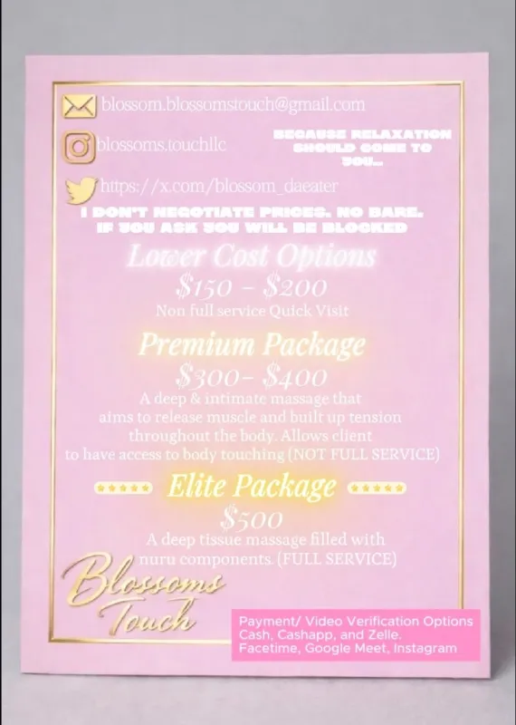 booking via Instagram @blossoms.touchllc Experience professional massage therapy in the comfort of your own space. My mobile massage services are designed to fit your lifestyle, bringing relaxation, relief, and personalized care directly to you. Whether you’re unwinding after a long day, recovering from physical activity, or simply taking time for yourself, I provide a calm, professional experience that helps you feel refreshed and restored—without the stress of traveling for incall. Please have your own space such as hotel room or apartment https://tryst.link/escort/blossom444